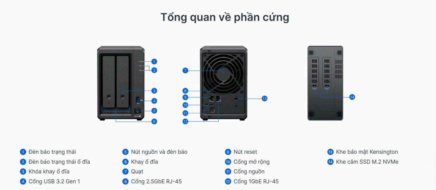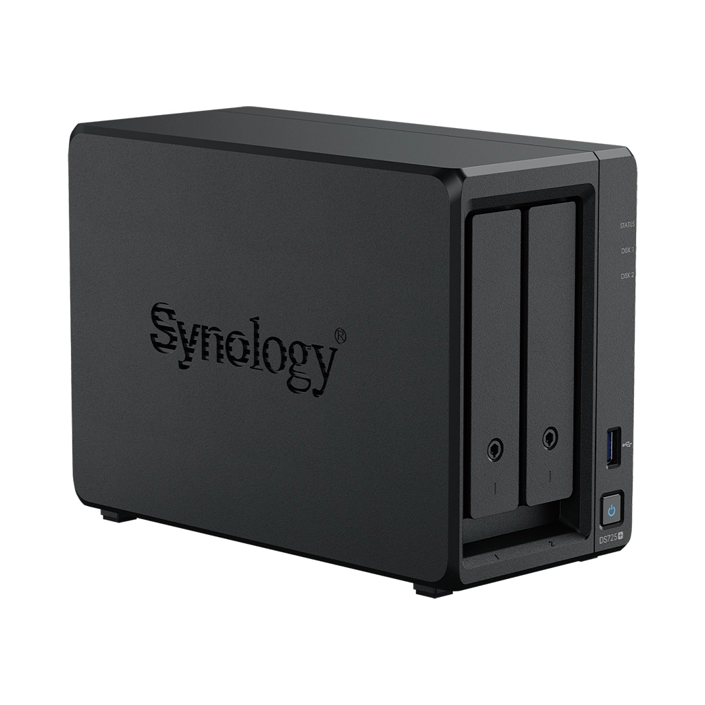 DS725+ có tính năng mạng 2.5GbE tích hợp và hỗ trợ cả SSD SATA và HDD trong các khay nội bộ 2.5″/3.5″, cũng như ổ đĩa M.2 NVMe thông qua khe cắm M.2 để sử dụng làm bộ nhớ đệm